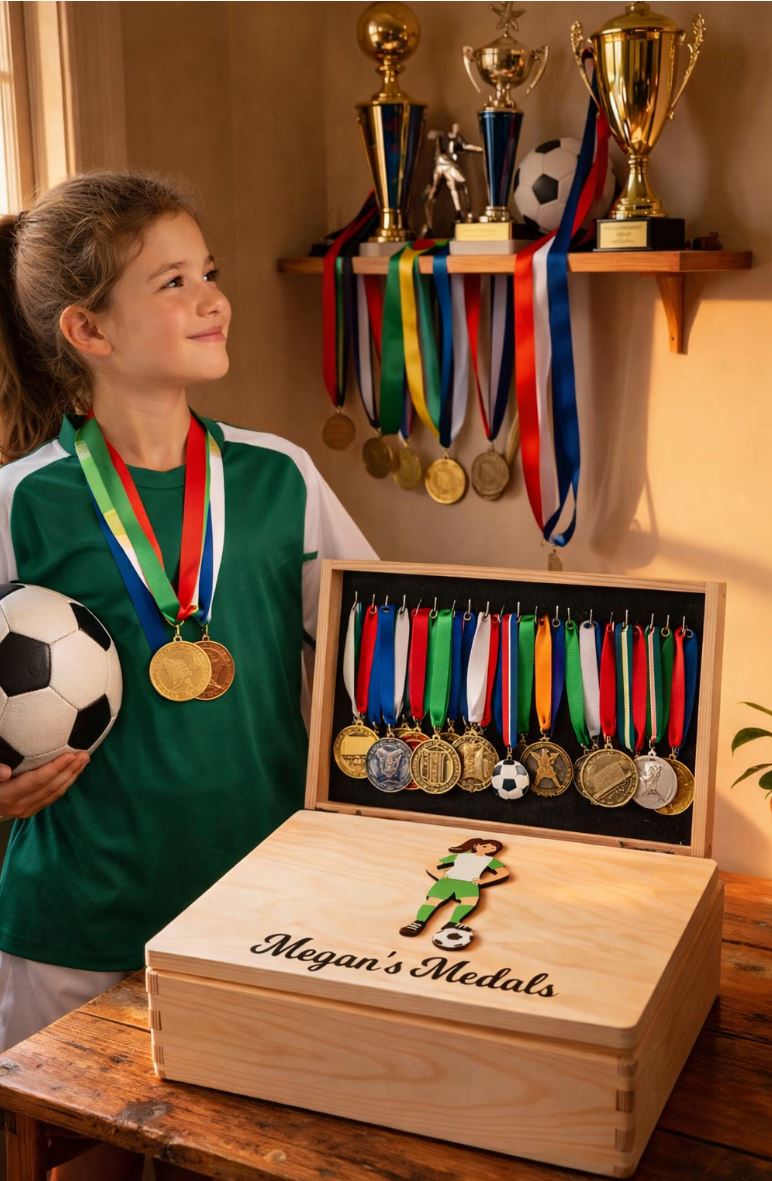 Choose male and female player, Choose what colour kit, hair and skin colour you would like on the soccer player. Great to make the soccer player look like the recipient of the gift and the colours of their soccer club. The ideal gift for any soccer fanatic with a medal haul and nowhere to store them. Leave them speechless with this personalised medal keepsake box, something they will have to cherish their soccer medals. These personalised soccer medal keepsake boxes are the perfect gift for a birthday, mothers day, fathers day, communion, confirmation or Christmas present. A truly unique gift for any occasion.